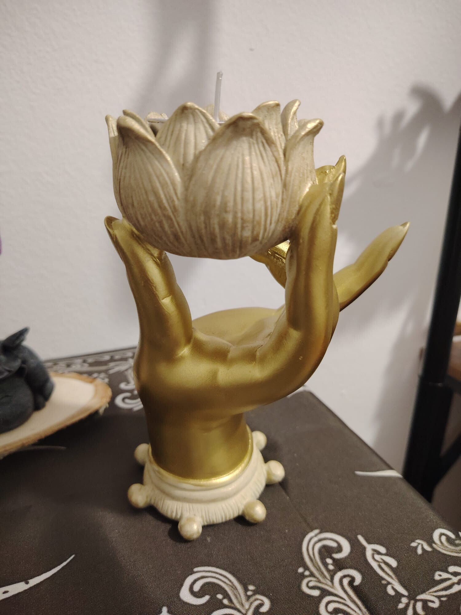 Portavelas figura de mano mudra sosteniendo flor, dorada.