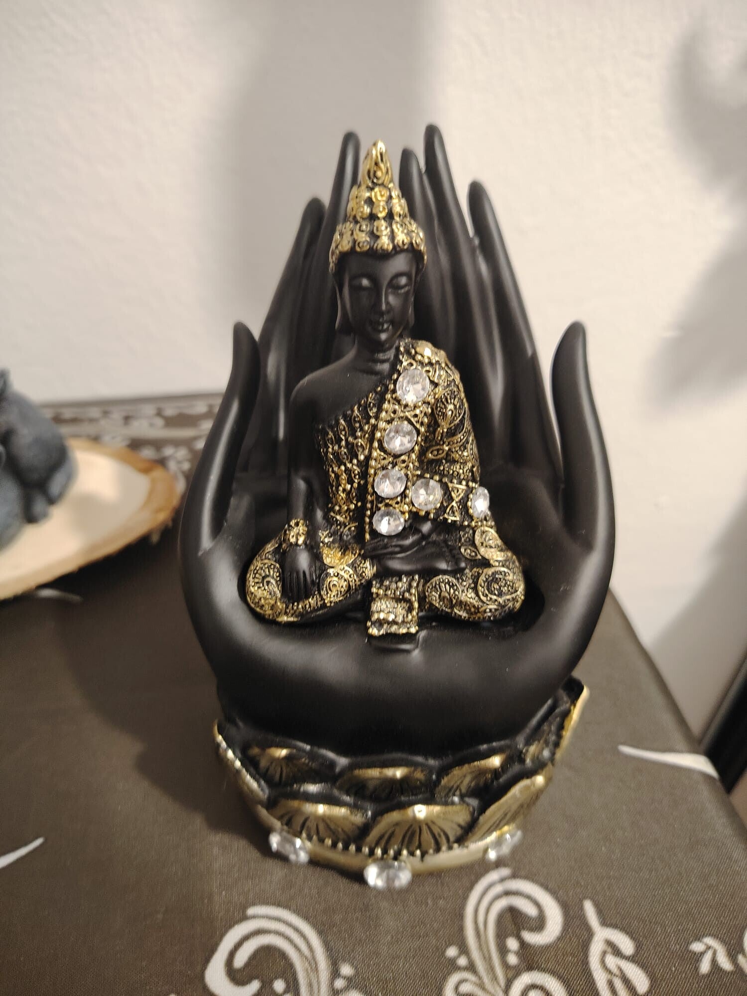 FIGURA RESINA BUDA NEGRA Y DORADA SOBRE MANO 9x14CM