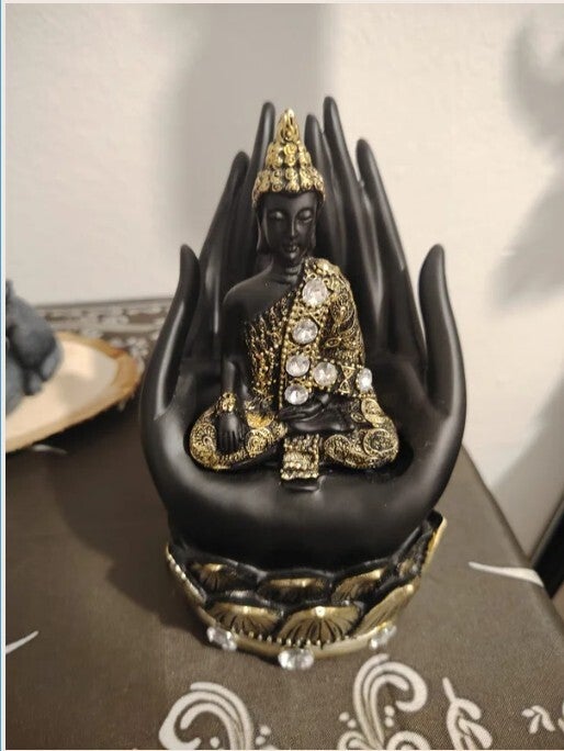 Mano con buda sentado, negra y dorada, ideal para tus altares y poder pedir.